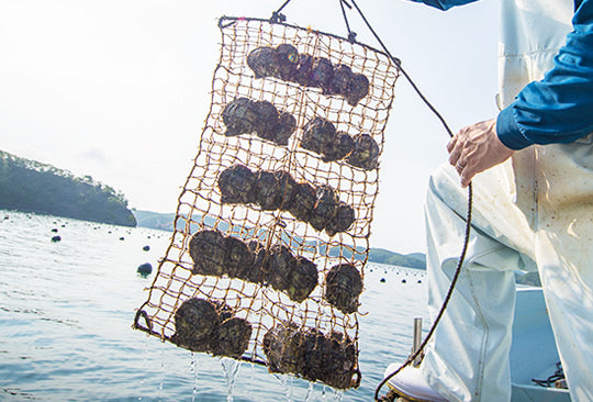30日間ほど貝をカゴにいれてイカダに吊って休ませます。
