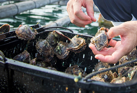 その間、貝の成長を妨げる海綿や海草、カキなどの付着物を取り除くための「貝掃除」を行います。
