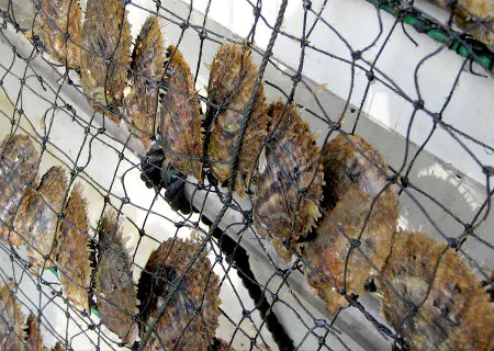 アコヤ貝の稚貝は養殖カゴに入れられ、1年から2年のあいだ海中に吊り下げられます。